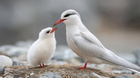 Witness the tender moment of an Arctic tern feeding its fluffy chick with a red fish near a rocky nest, highlighting the beauty of wildlife and parental care in nature.