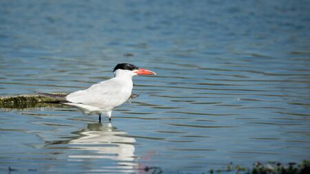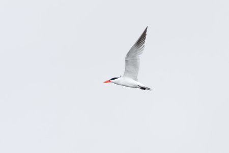 Close up, isolated image of a Caspian tern (Hydroprogne caspia) characterized by red bill, black legs and dark coloration at the tip of the wings and around eyes. Image was taken in Maryland.