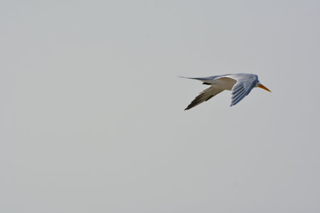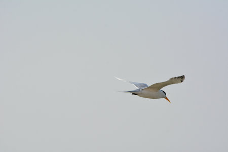 Flying royal tern Thalasseus maximus on the white sands of Clam Pass in Naples, Florida.