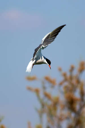 Closeup Portrait of Common Tern (Sterna hirundo). Adult common tern in flight on the blue sky background. blue sky background