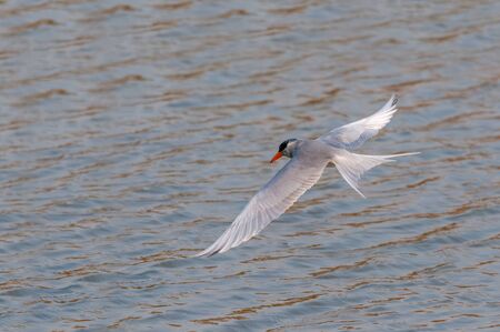 A tern in flight. Sea Wave Background. Adult common tern in flight. Scientific name: Sterna hirundo. Ladoga Lake. Russia.