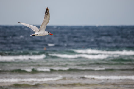 Caspian tern flying low over rough sea waves along Red Sea coast in Egypt, powerful seabird in motion against marine background