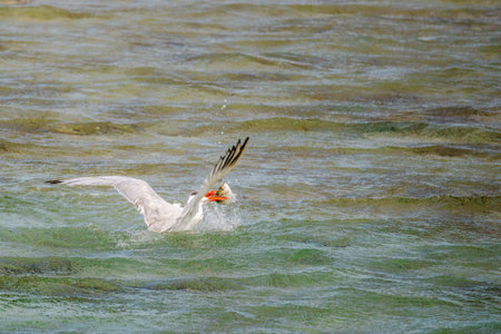 A Caspian Tern (Hydroprogne caspia) taking to the air with a fish after a dive