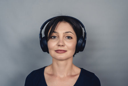 Beautiful brunette woman in dark t-shirt posing isolated on gray background studio portrait. People lifestyle concept. Listening to music in headphones