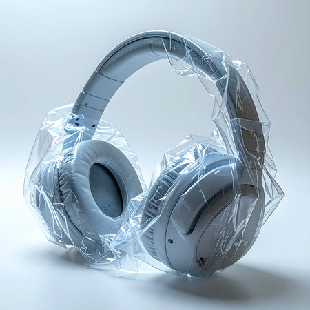 Fresh out of the box, a new pair of modern headphones sits sealed in its protective plastic wrapping.