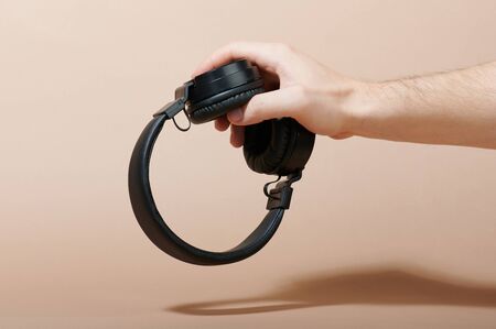 Classic black wireless headphones on colored paper background. Retro style. 80s. Pop culture. Top view. Minimal Music Concept. Hands holding