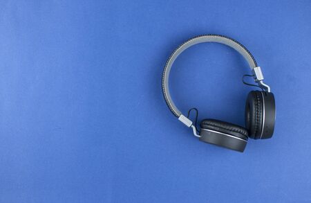 Top view of headphones on blue background. Minimalist photo of earphones with copy space