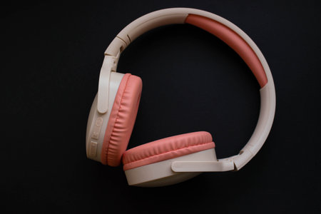 Classic black wireless headphones on colored paper background. Retro style. 80s. Pop culture. Top view. Minimal Music Concept