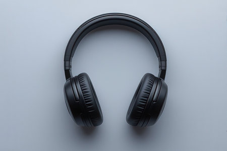 Minimal flat lay of wireless headphones on matte black. Contemporary product shot with generous negative space for design or text.