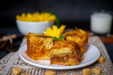 Pineapple bread, the typical food of the city of Tegal, Indonesia, decorated with pinneaple, banana, chocolate, milk and cheese