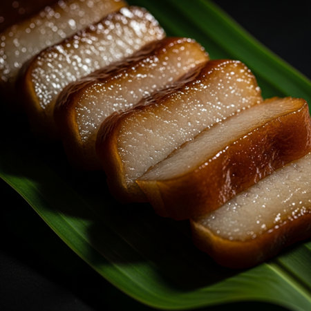 A minimalist shot of a traditional Thai dessert unwrapped from its banana leaf, with its soft coconut filling and flour texture in focus.