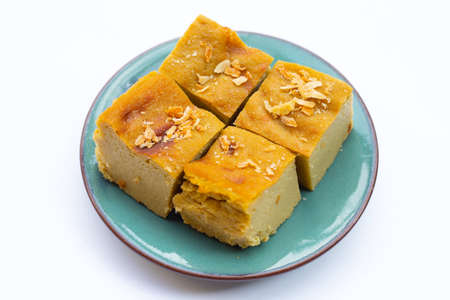 Coconut custard made from eggs with soybean and coconut milk on white background. on white bowl