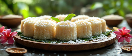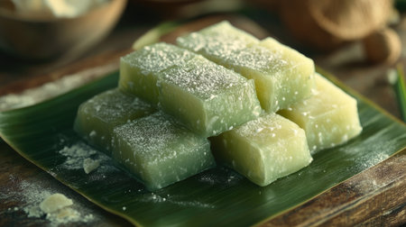 A tempting display of coconut sweet treats served on a natural leaf plate, showcasing a creamy texture and inviting appearance. Perfect for dessert lovers.