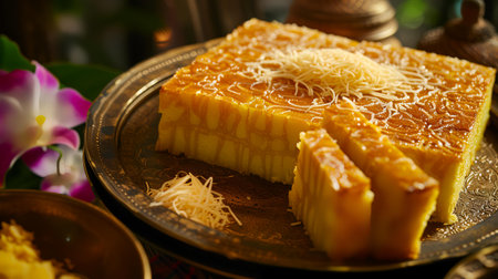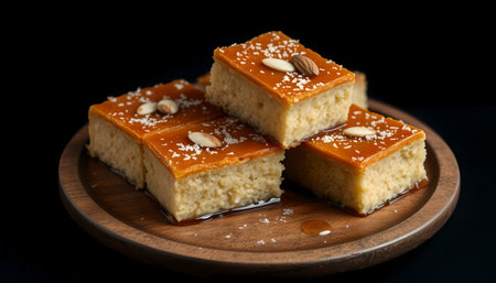 top view, plate of freshly baked basbousa squares with coconut flakes and syrup glistening. Generative