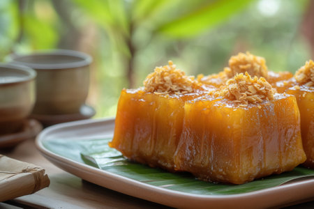 Golden, glistening dessert squares on banana leaf, garnished with crispy topping, served on a plate with teacups in background.