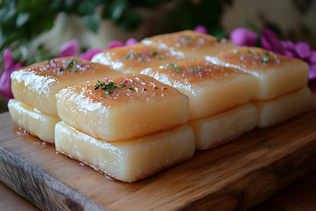 A stack of perfectly arranged sweet mochi desserts with a shiny caramel glaze, garnished with a touch of herbs, set on a wooden board. pink flowers and lush greenery in the background enhance the composition. Generative AI