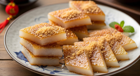 A plate of diamond-shaped, pan-fried rice cakes (Nian Gao), sprinkled with crushed peanuts. The dish is on a decorative plate on a wooden table, with a Chinese New Year decoration in the background. This represents traditional Chinese dessert.