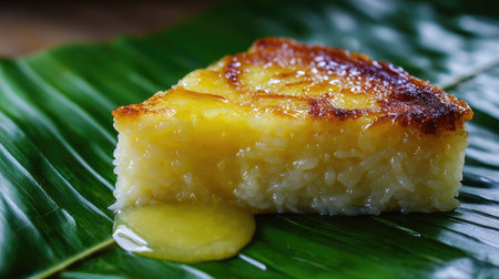 This enticing slice of coconut sticky rice dessert is presented on a green leaf, featuring a beautifully glazed top and a drizzle of melted butter for added sweetness.