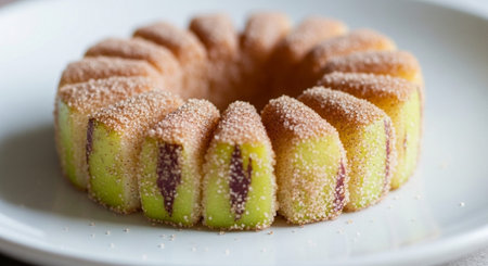 A close-up of a caramel custard cake slice, perfectly browned with a glossy top, served on a speckled white plate. accompanied by a dusting of matcha powder, creating a blend of rich sweetness and subtle bitterness, ideal for gourmet presentations. Generative AI