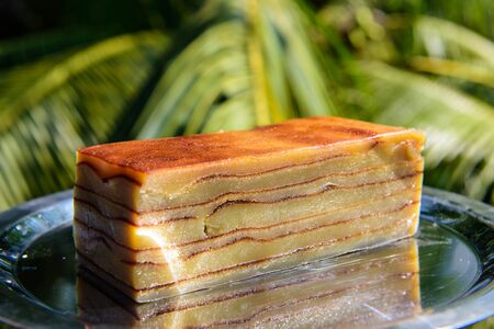 Bebinca, traditional Goan dessert from coconut milk dough, sweet Indian pudding on a metal plate, close up. Goan-Portuguese pie, delicious pieces in sunlight against palm leaves.