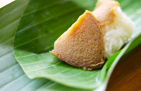 Traditional Thai sweet menu, sticky rice with pumpkin custard in banana leaf package, natural light, close-up food image, selected focus on pumpkin custard.