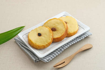 Kue Lumpur or Mud Cake, Indonesian traditional snack made from potatoes, flour, eggs and coconut milk topped with raisins. Selected focus.