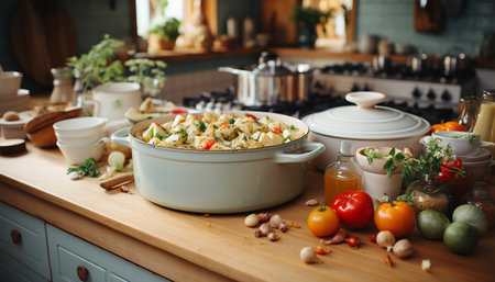 A cozy kitchen scene featuring a bubbling stew in a cast-iron pot on the stove, with aromatic herbs and spices arranged nearby, evoking warmth and comfort.