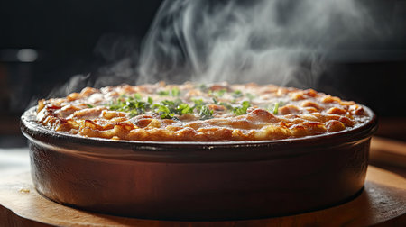 A vibrant image showcasing a hot and steaming baked dish just out of the oven, exuding warmth and comfort in a cozy kitchen setting.