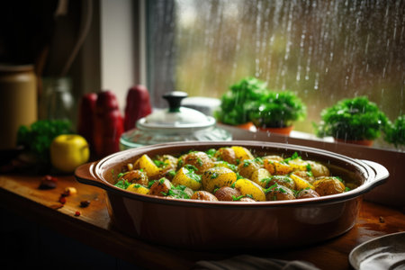Home Comfort Cooking A Delicious Meal On A Rainy Day. Concept Comfort Food Recipes, Easy Meals For Rainy Days, How To Make Delicious Meals At Home, Enjoying A Homecooked Meal On A Rainy Day.