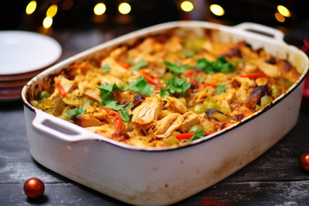 boxing day leftover turkey and dressing casserole in oven, created with generative ai
