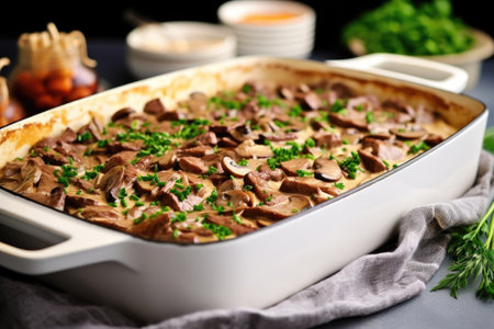 baking dish filled with creamy beef stroganoff, created with generative ai