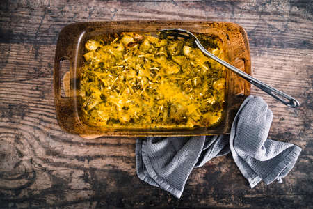 Cheese curry chicken baked in a ceramic form on background wooden table