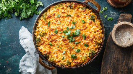 A delicious baked pasta dish topped with melted cheese and fresh herbs, creating a warm and inviting centerpiece for a cozy dinner setting.