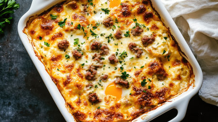 Overhead view of a savory breakfast casserole with eggs, sausage, and cheese