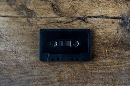 Black audio cassette on wooden background