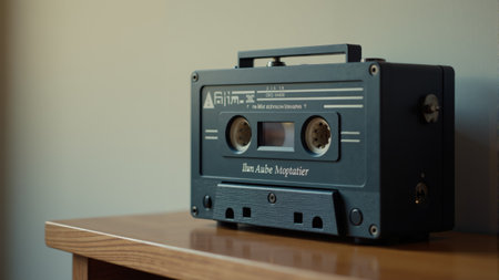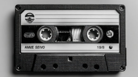 Nostalgic Sound Era: Close-up of an old cassette tape that evokes the past, capturing the essence of analog sound and a bygone era, reminiscent of the days of mixtapes and personal soundtracks.