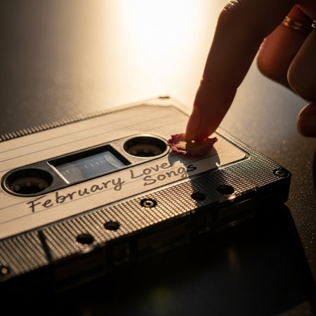 Cassette tape forming a delicate heart pattern on a pink surface, surrounded by small decorative elements, symbolizing love songs.