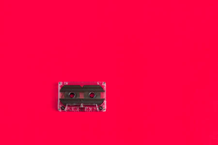 Top view Audio cassette. Vintage audio cassette on colored background. Old cassette tape audio isolated on red