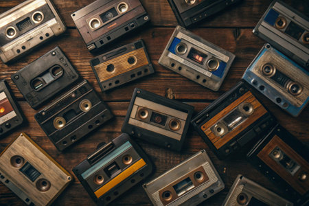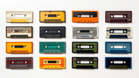 Collection of Retro cassette tapes of vibrant hues. Top view. Background. Concept of vintage music, collectible items, the 80s and 90s culture, and the charm of physical media. Banner