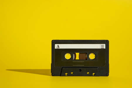 Black audio cassette, tape on a yellow background. Cool musical and retro idea