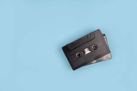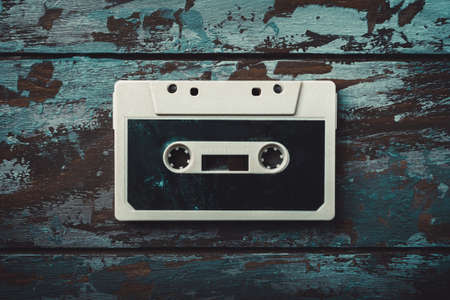 Old casette tape from top view composition. Retro styled photo.