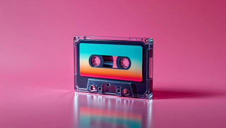 Retro transparent audio cassette with a colorful label is reflecting on a vibrant pink background. Ai generated image