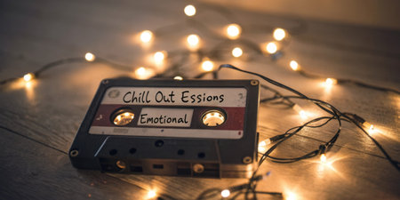 A cassette tape gently illuminated by soft fairy lights its label showcasing uneven handwritten text with song titles such as Chill Out Sessions and Emotional Echoes. The warm glow.