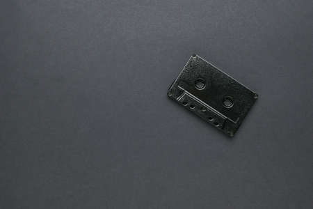 Top view of an old cassette tape on a dark gray background. Music icon of the 80s and 90s. Close up.