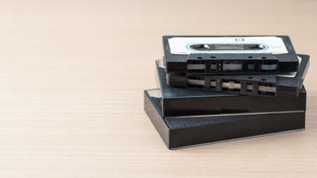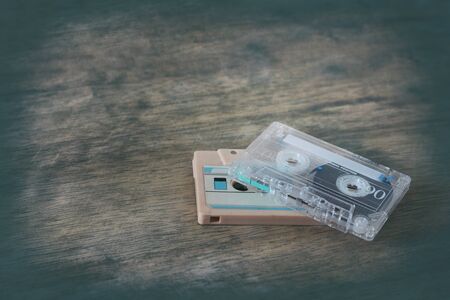 Old Audio Cassettes on a Wooden Planks Background closeup