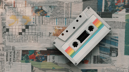 White retro cassette tape placed on old newspaper background vintage style still life composition nostalgic concept of analog music and classic sound recording