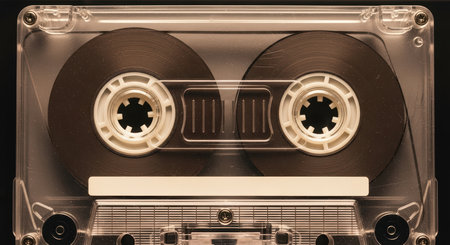 Classic transparent audio cassette with visible magnetic tape reels