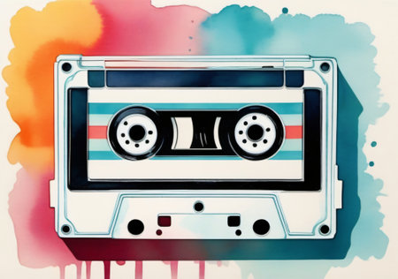 A vibrant display of colors bursts around a classic cassette tape, highlighting the nostalgia of vintage music. The contrasting colors radiate energy and creativity, inviting admiration.