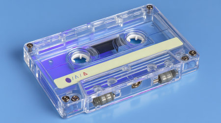 Close-up of a transparent cassette tape resting on a vivid blue background, evoking nostalgia for vintage music and audio technology from the past.