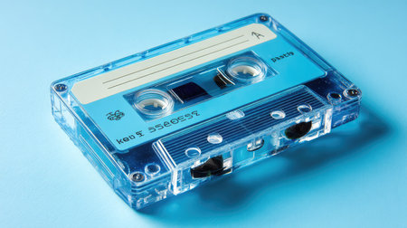A vintage blue cassette tape rests on a vibrant background, evoking nostalgia and memories of past music experiences. Perfect for retro-themed projects.